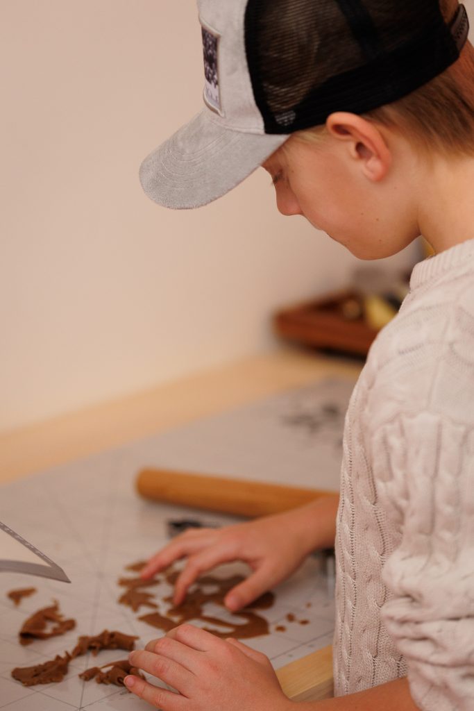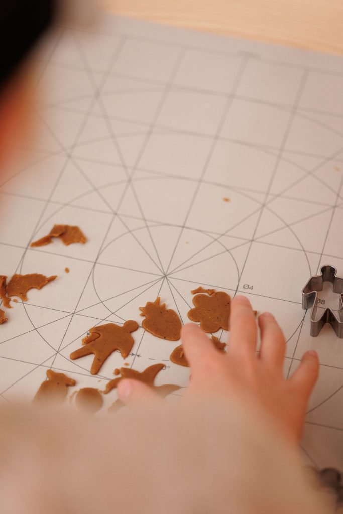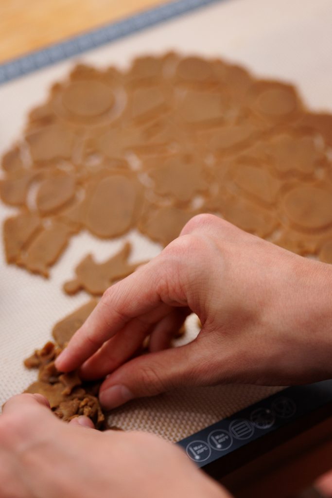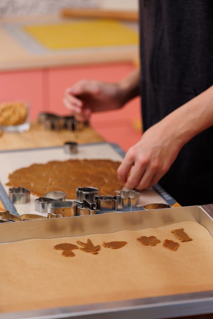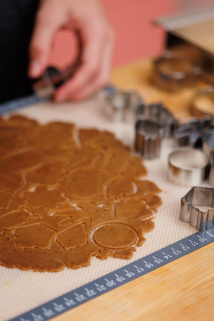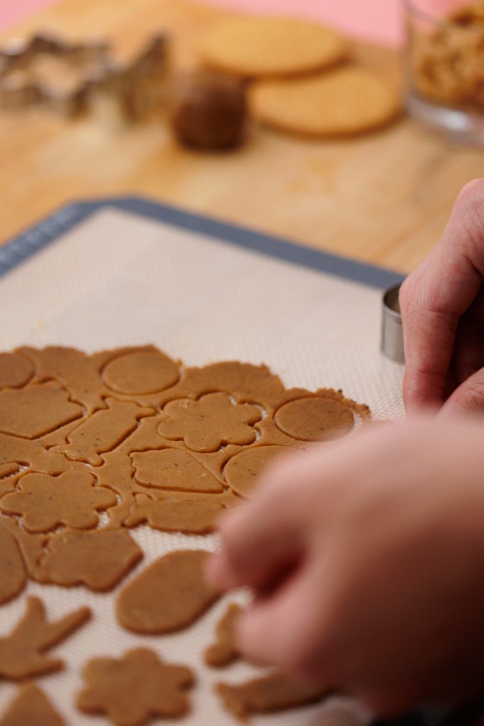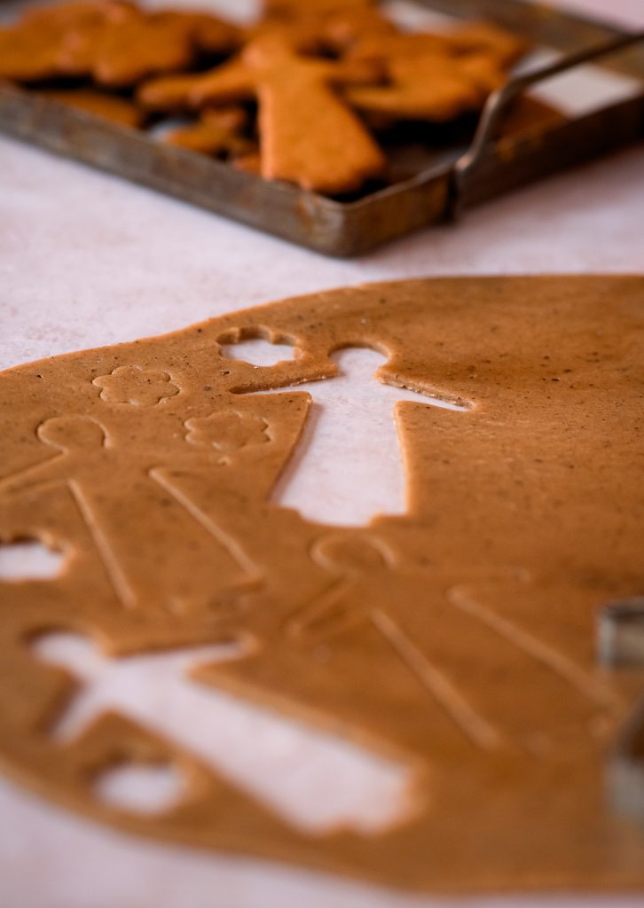 Kavla ut en del av degen i taget. Kavla tunt och stansa ut pepparkakor. Lägg på plåt med bakplåtspapper och grädda i mitten av ugnen i ca 4-5 minuter. Håll koll på gräddningen mot slutet! Låt dem kallna på plåten.